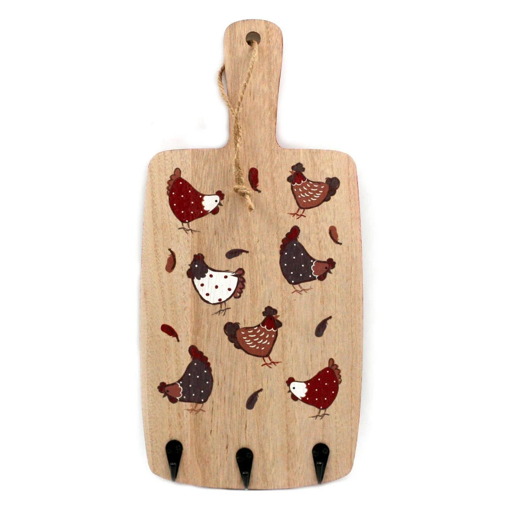 Ajoutez une touche de charme à votre cuisine avec cet accroche torchons en forme de planche à découper. Fabriqué en bois, il arbore des illustrations de poules dans des tons marron/rouge, apportant une ambiance chaleureuse et rustique. Equipé de 3 crochets en métal, il permet de suspendre torchons, serviettes ou chiffons de manière pratique et décorative.
