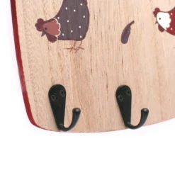 Cet accroche Torchons en forme de planche à découper, en bois, saura décorer votre cuisine avec ces jolies illustrations de poules dans les tons marron/rouge. Avec 3 crochets en métal pour suspendre torchons, serviettes ou encore des chiffons. Dimensions 37 x 17.5 cm