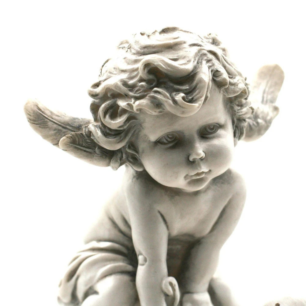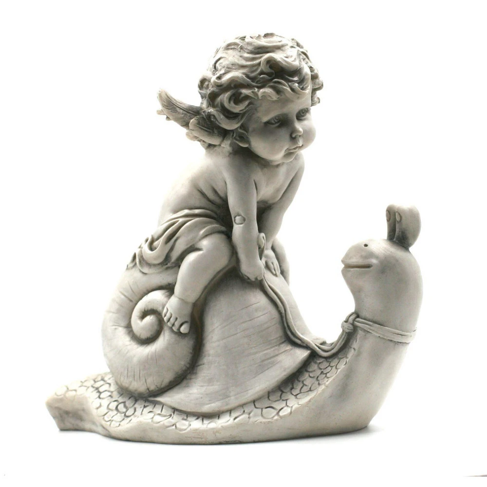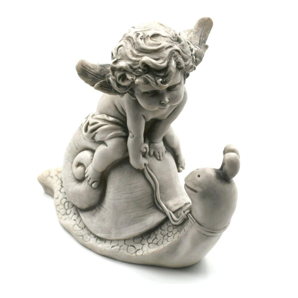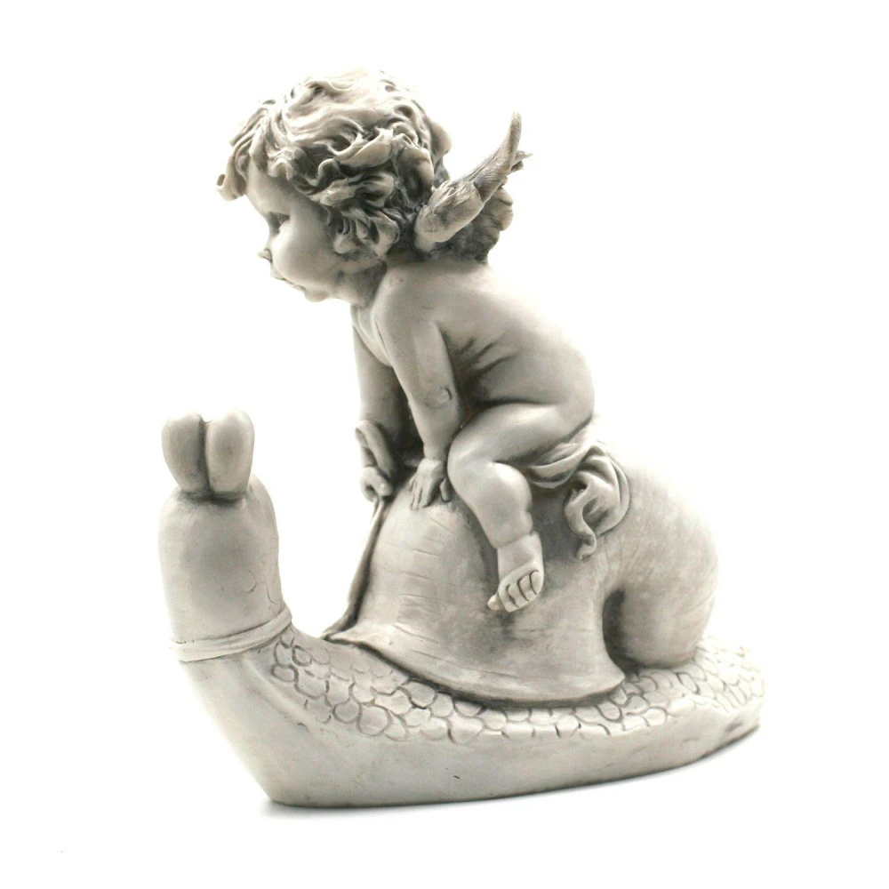 Sujet décoratif en résine représentant un ange sur le dos d’un esgargot.