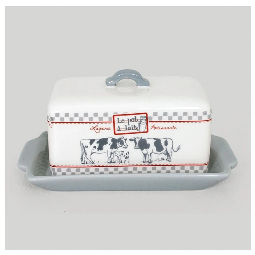 Ce beurrier entièrement en céramique de la collection « Milk » est illustré de vaches et de pot au lait. Dimensions 18 x 10 cm