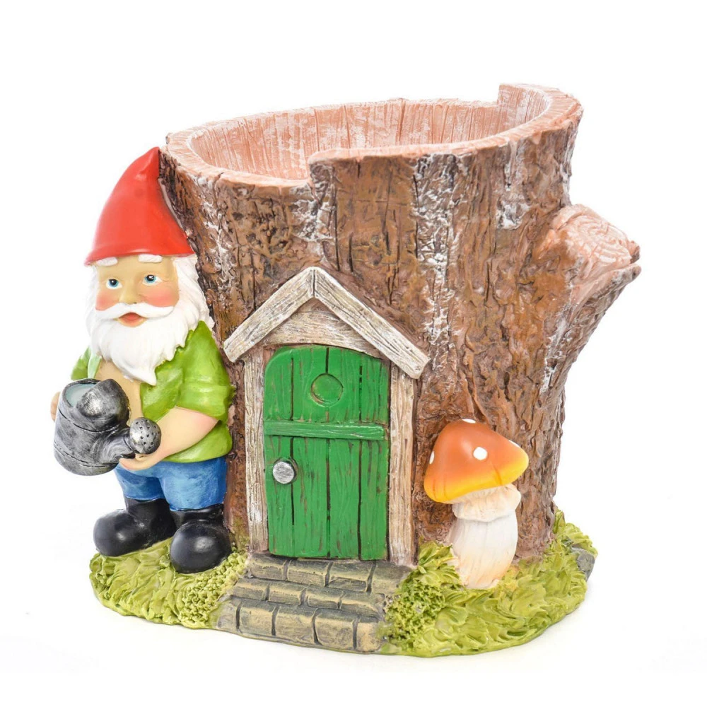 Cette souche d’arbre est la maison d’un gentil Nain de Jardin qui vous servira de décoration extérieure accueillante et colorée. Dimensions : environ 13 x 14 x 13 cm.