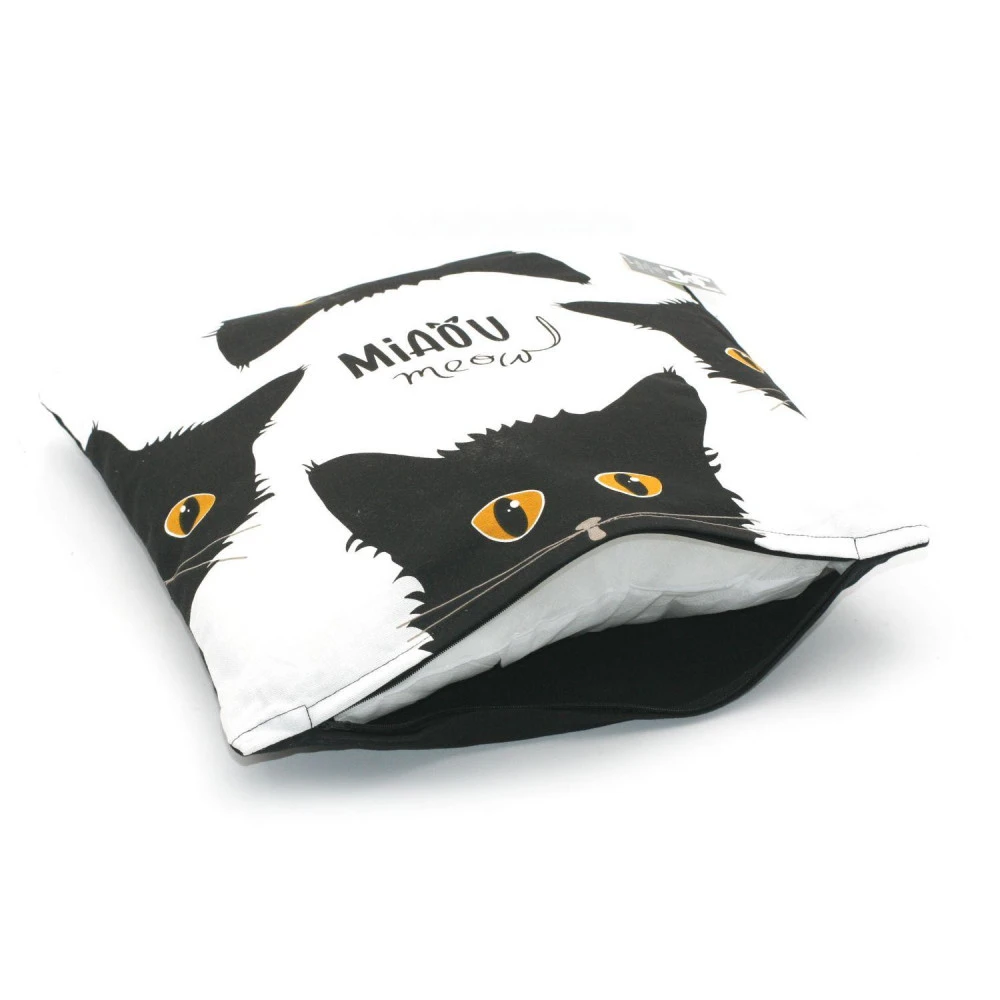 Joli coussin de la collection Meow, avec dessin de Chats noir sur fond blanc et l’inscription « Miaou Meow » au centre. 100% Coton, dimensions 40 x 40 cm