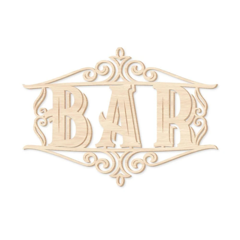 Décoration en bois en forme du mot Bar encadré d’ornements.