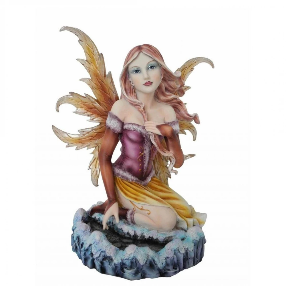 Cette fée en résine à été peinte à la main et possède de magnifiques ailes oranges.