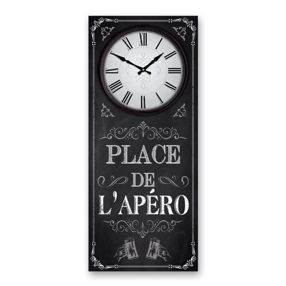 Horloge dans un style brasserie vintage, fond couleur bois noir avec inscription « Place de l’Apéro » et des détails blancs. Fonctionne avec une pile LR6 non fournie, dimensions 70 x 30 cm