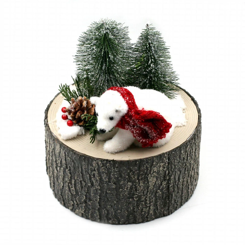 Décoration de Noël, scène avec un Ours Polaire habillé d’une jolie écharpe rouge sur un tronc tapissé de Neige. Avec houx et sapin en tige en métal, élément de déco à poser. Dimensions du produit environ 21 x 24 cm