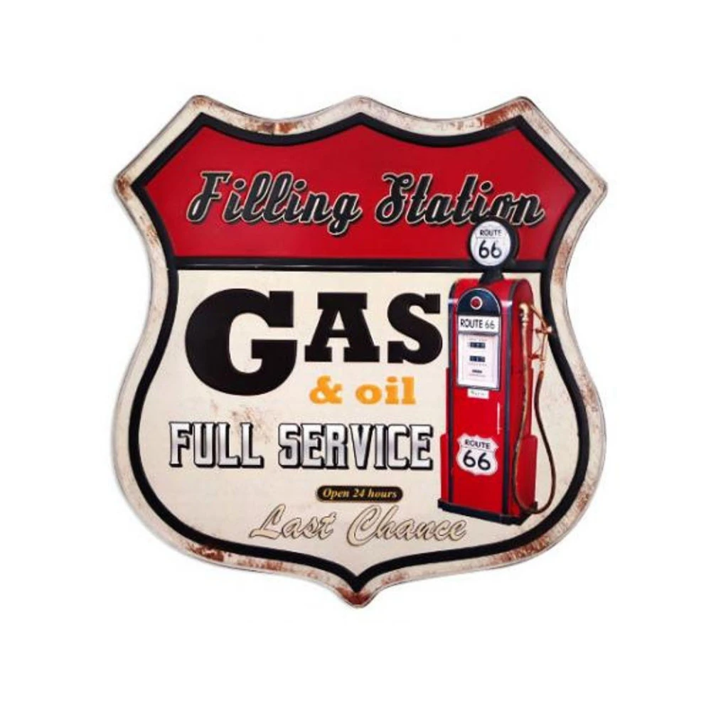Grande plaque décorative Full Service en tole emboutie pour créer votre décor en relief, effet ‘Vintage’, aux motifs de la célèbre Route 66, dimensions 40 x 42 cm