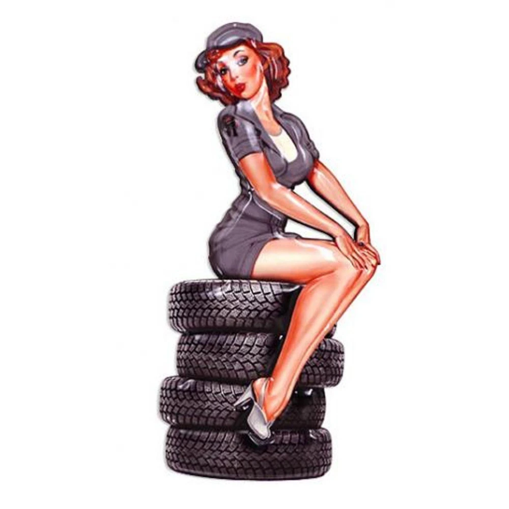 Décoration en métal avec une Pin-Up assise sur des pneus, plaque de déco allure vintage