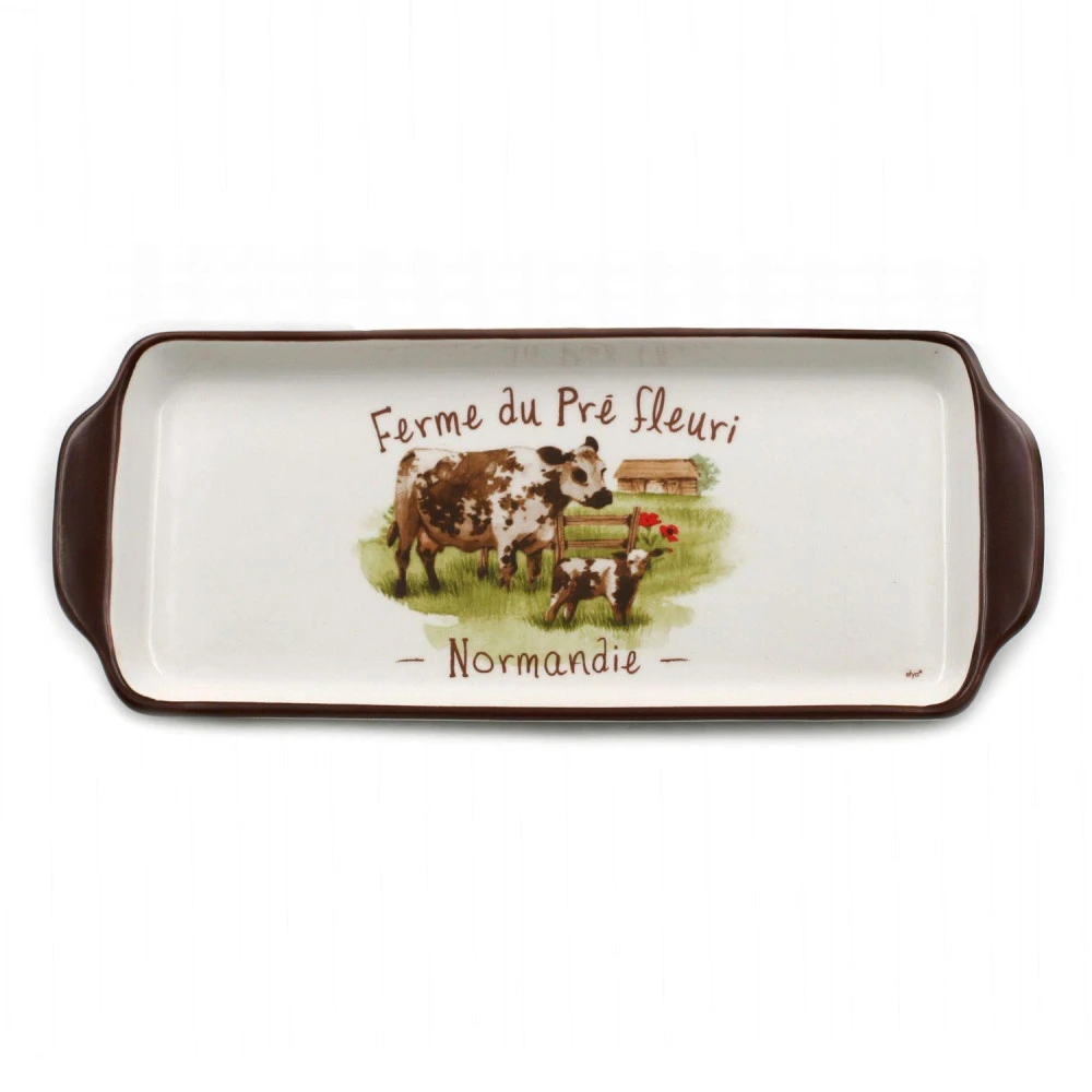 Plat rectangulaire (30 x 12 cm) en faience parfait pour vos cakes et gateaux, ce plat possède des motifs de Vache de la collection la Ferme du Pré Fleuri. Pour une décoration de cuisine pleine de caractère, ce plat peut aussi passer au lave-vaisselle et au micro-ondes