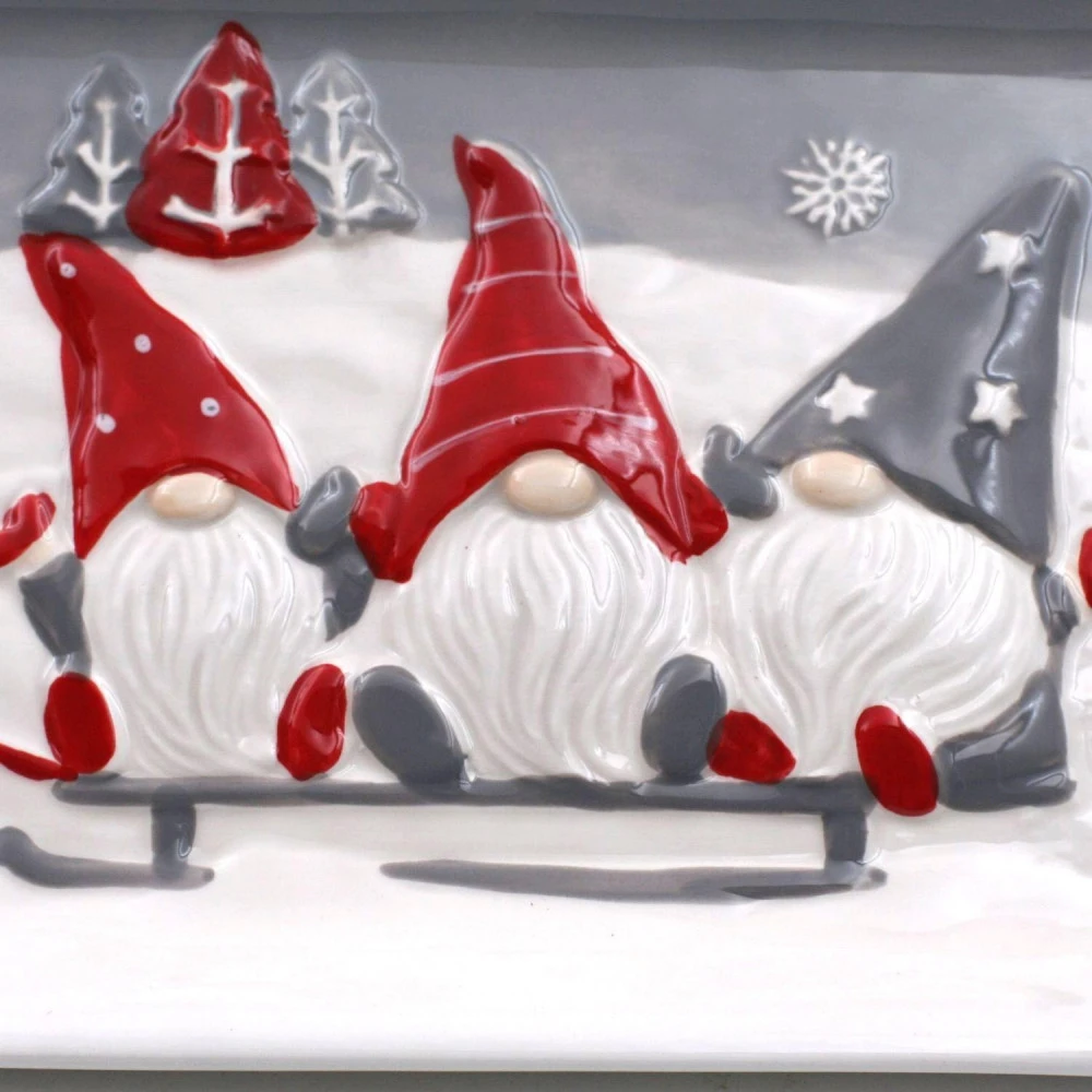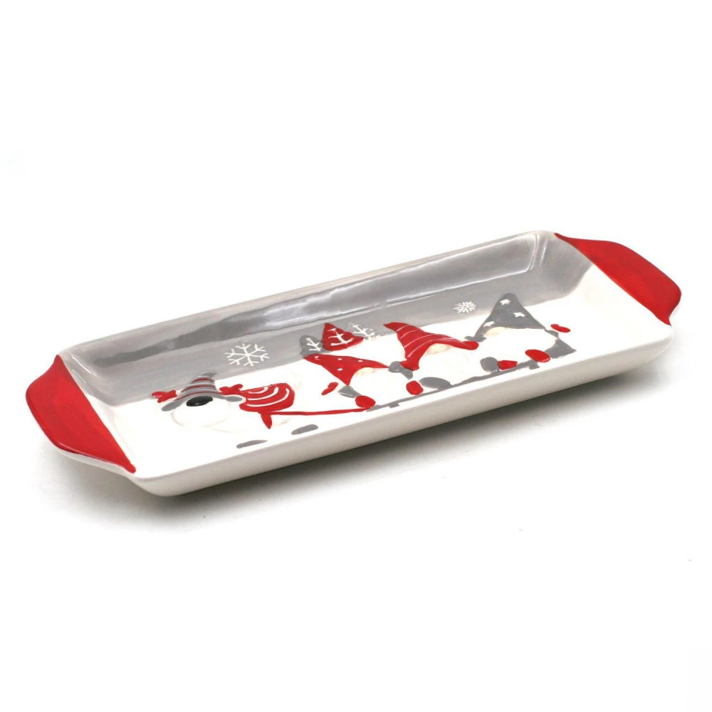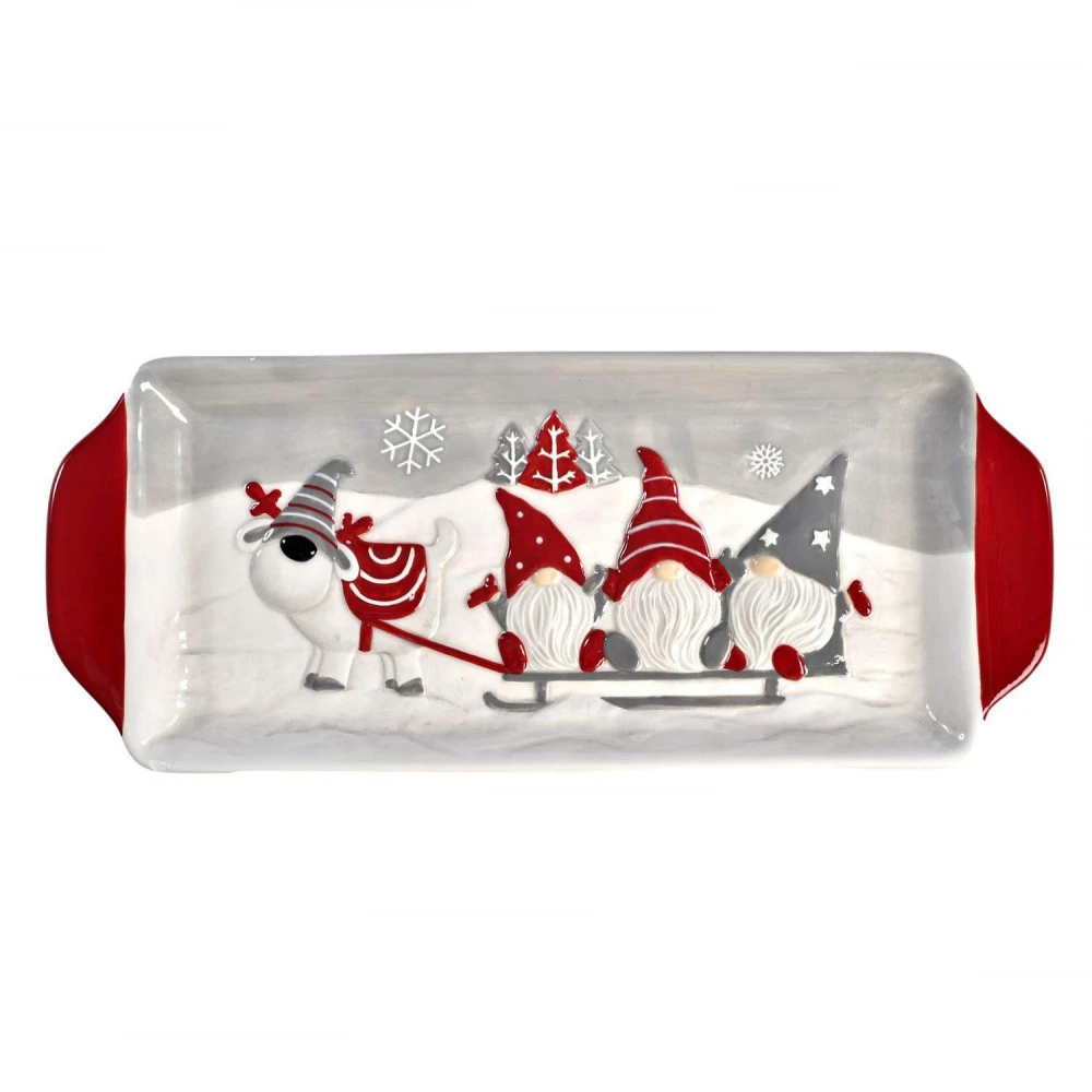 Pour présenter vos cakes lors de repas de Noël, voici un superbe plateau rectangulaire en céramique des petits reliefs et un motif de Lutins Nordiques dans un fond enneigé, petits bords de couleur rouge. Plateau d’environ 36 x 15 cm, le lavage à la main est préconisé.