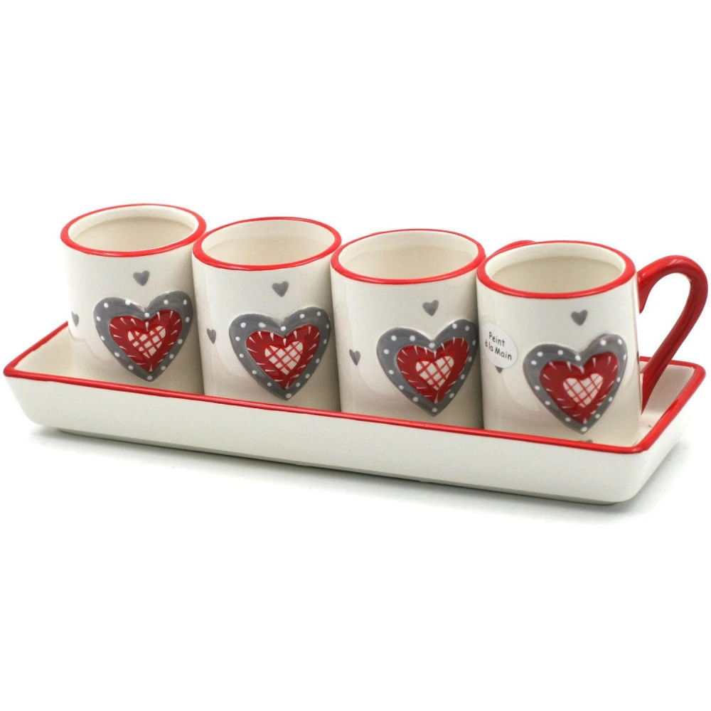 Dans le motif coeur découvrez ce set expresso avec 4 tasses ainsi que un plateau. Peint à la main. Dimensions : Plateau : 25 cm x 7.5 cm x 3 cm, Tasse : 7 cm de Hauteur et 5 cm de diamètre