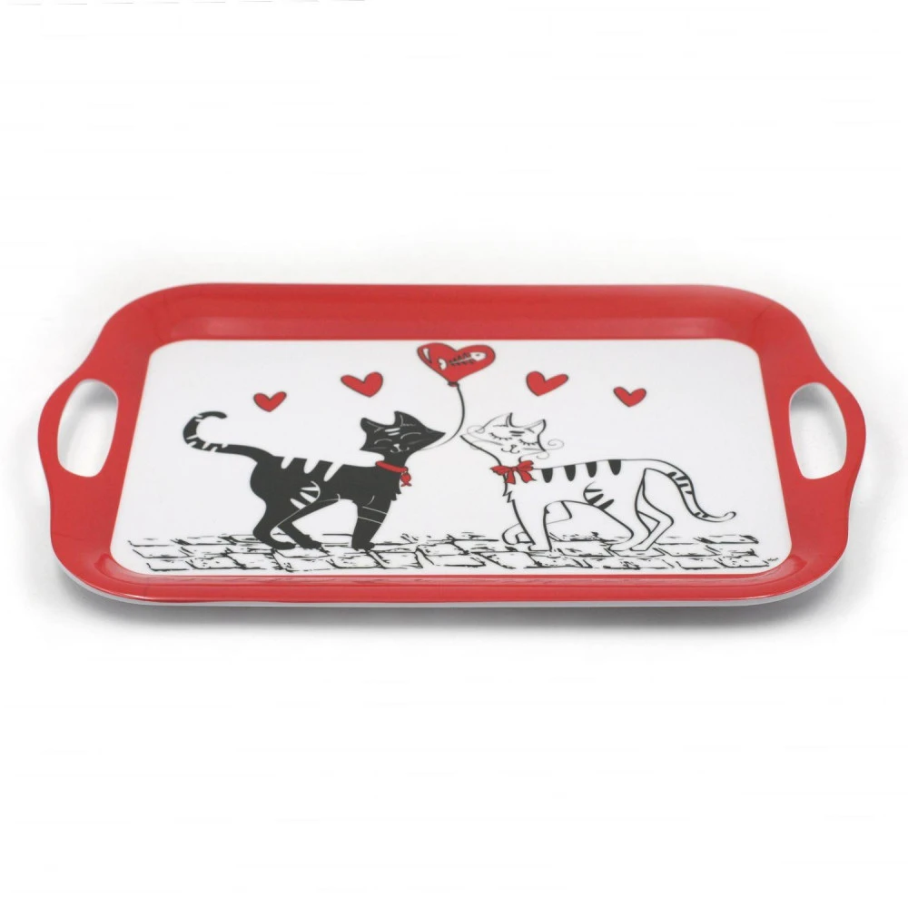 Plateau en mélaminé de la collection Choupy, bord rouge avec fond blanc et dessin de couple de chats. Ne passe ni au four ni au micro-ondes ni au lave-vaisselle. Dimensions 28 x 41 cm