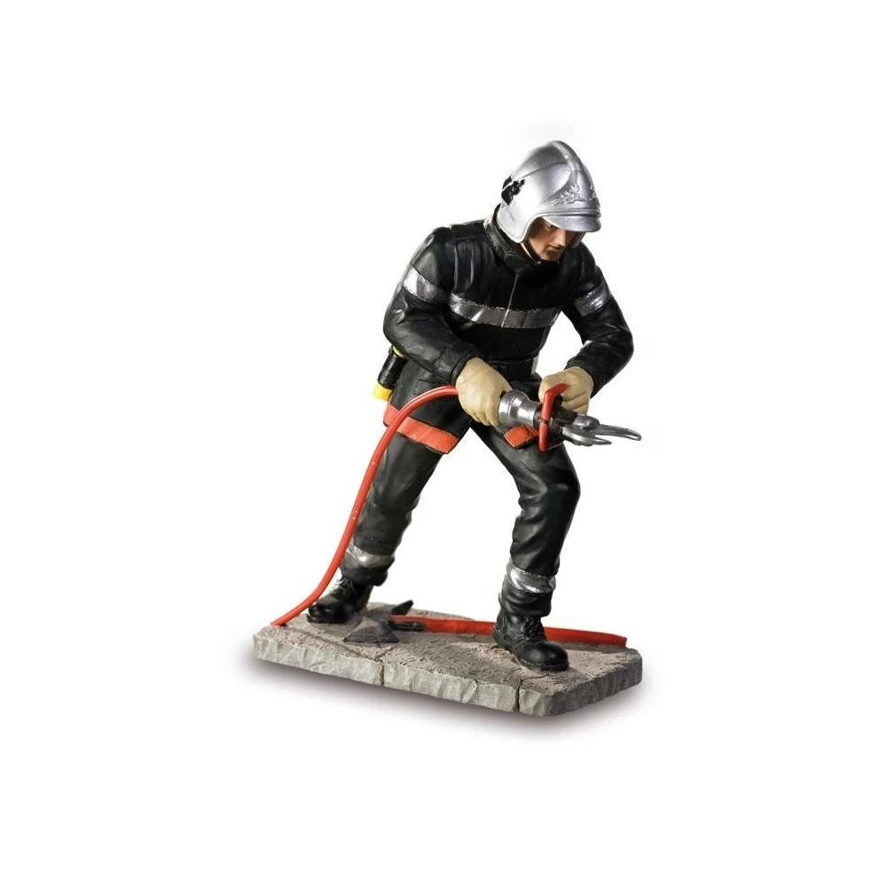 Figurine en résine d’une hauteur d’environ 17 cm représentant un pompier utilisant une pince de désincarcération