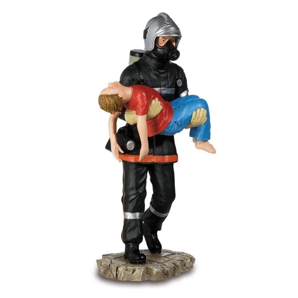 Figurine en résine d’une hauteur d’environ 20 cm représentant un pompier sauvant un enfant