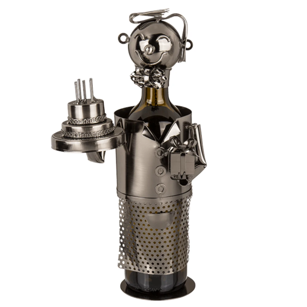 Découvrez le porte bouteille en métal anniversaire représentant une personne portant dans ses mains un gâteau et un cadeau à la main.