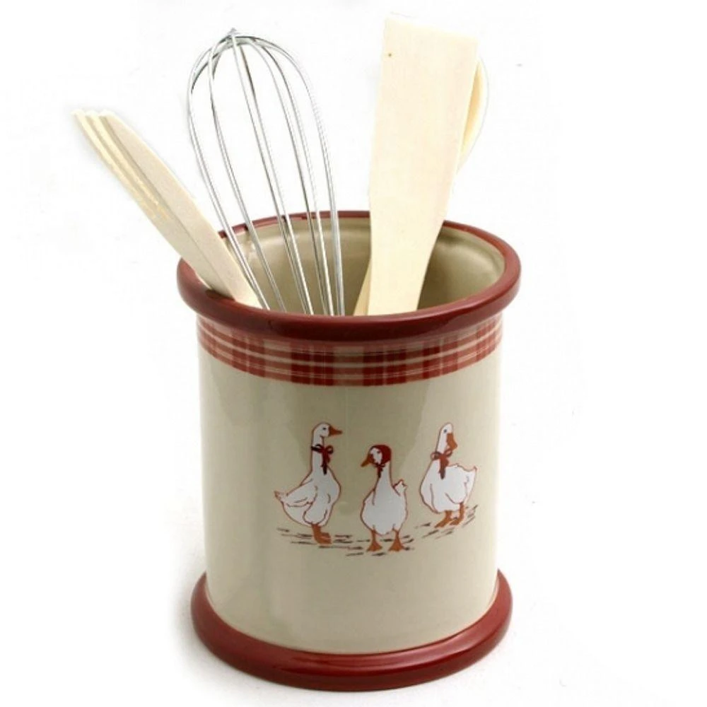 Joli pot en céramique composé de 4 ustencils de cuisine : un fouet et 3 traditionnels couvert en bois