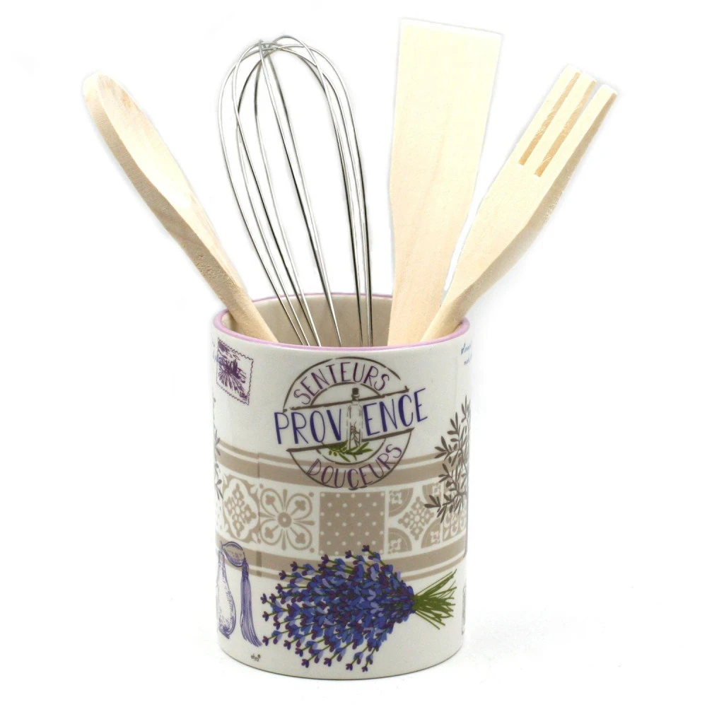 Ce porte ustensiles aux illustrations des senteurs provençales est livré avec 4 ustensiles indispensables en cuisine :