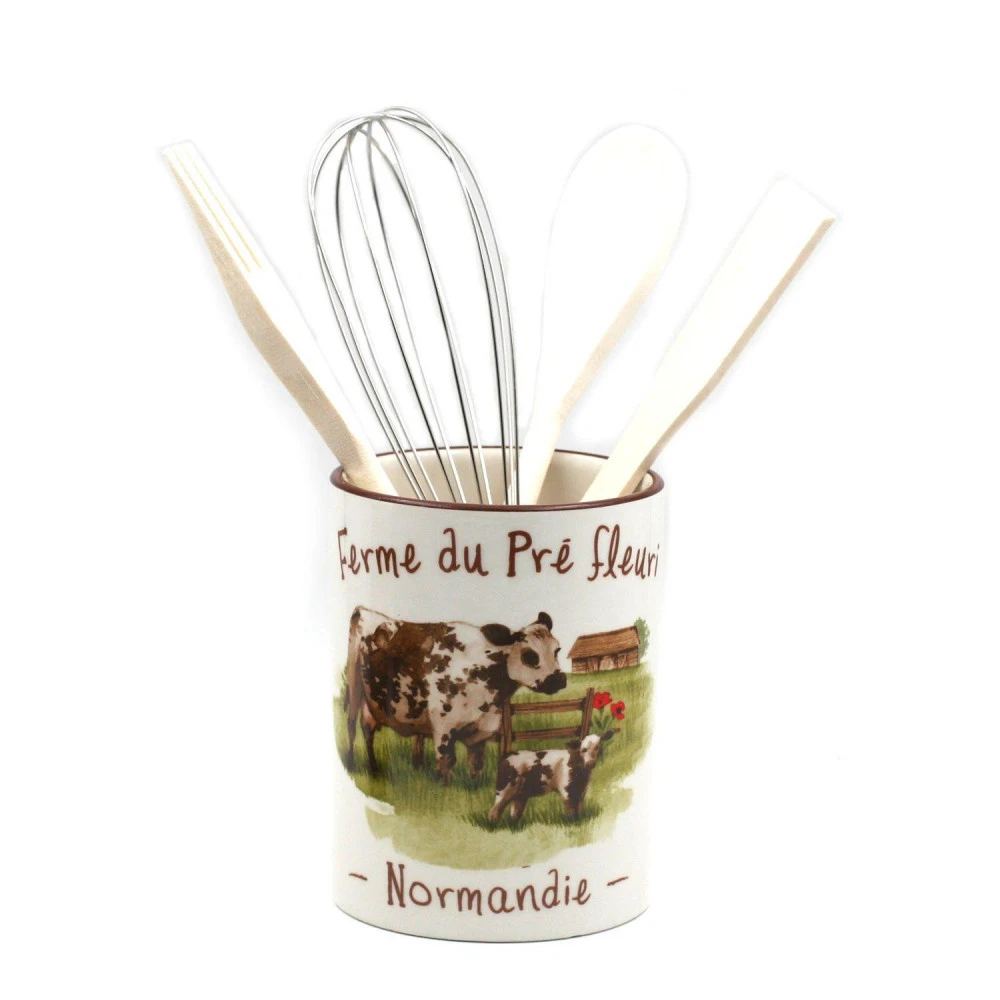 Ce pot avec ses ustensiles sauront décorer votre cuisine tout en étant pratique. Illustration de vache de la collection La Ferme du Pré Fleuri. Pot en faience peut passer au lave-vaisselle, 3 ustensiles en bois et un fouet. Dimensions du pot : diamètre 10 cm et hauteur 13 cm
