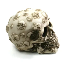 Cette statuette de crâne gothique est en résine décoré de multiples têtes de mort.