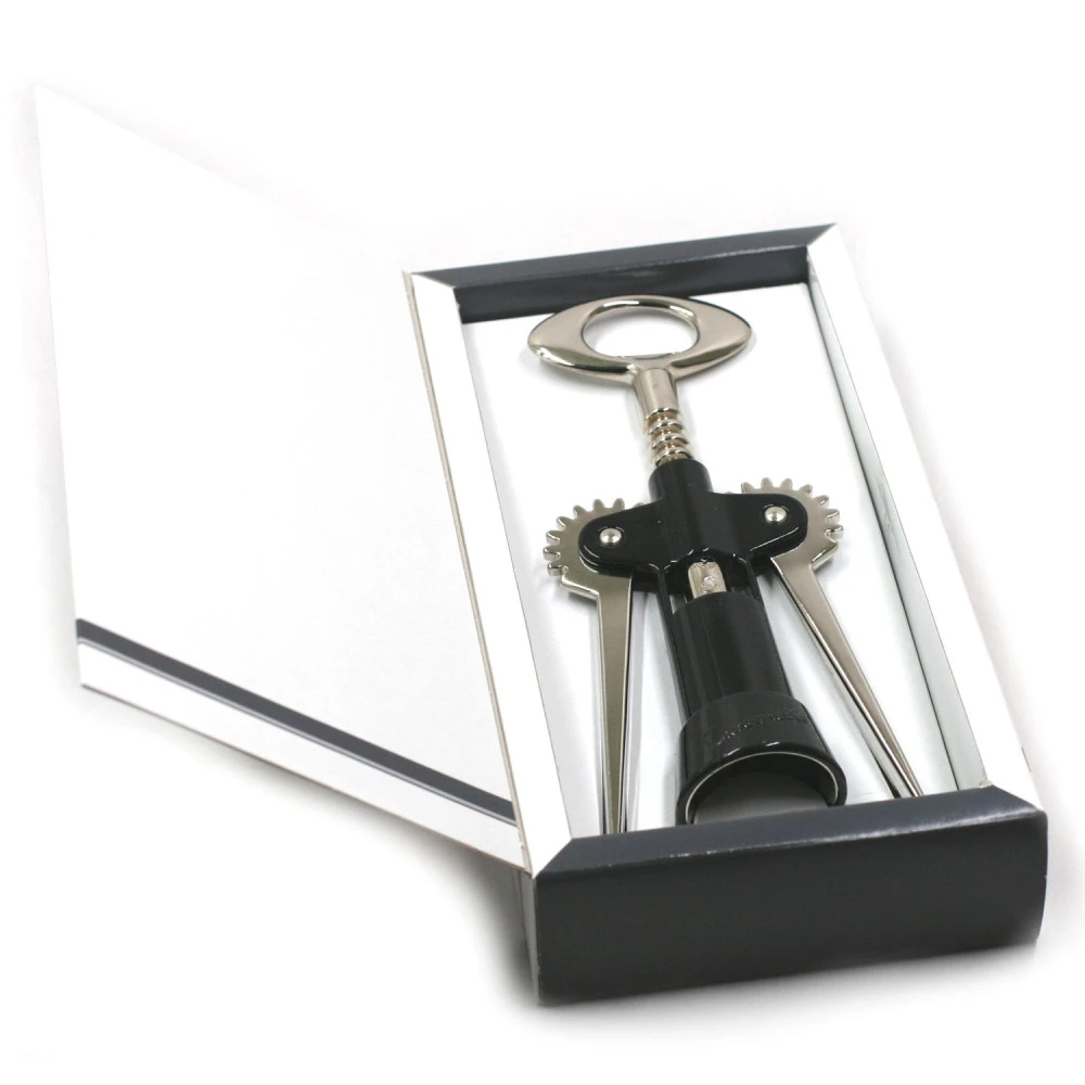 Tire-bouchon 2 leviers « TAVERNELLO ». A offrir aux inconditionnels du bon vin. De couleur noir, présenté dans coffret cadeau.