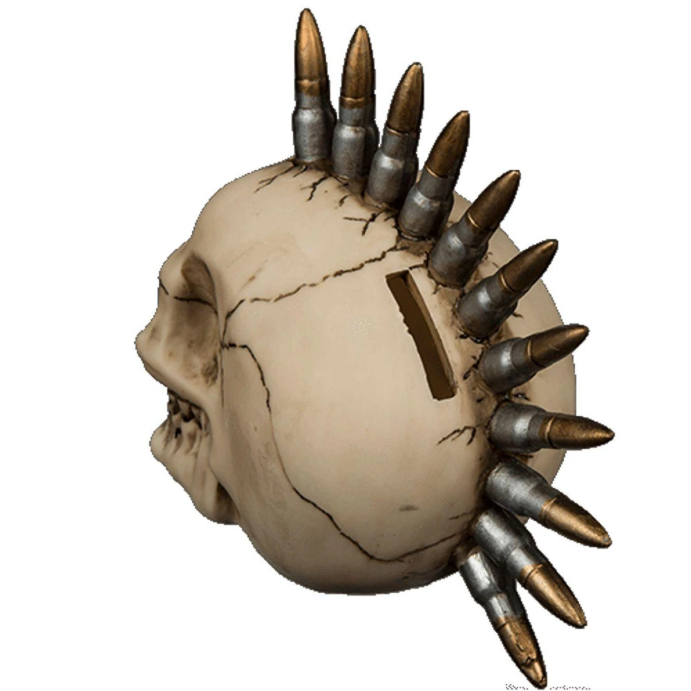 La tirelire crâne punk à cête de balles avec son aspect réaliste fera à la fois un bel élément de décoration et un objet pratique elle se ferme par une serrure et une fois intégrée à votre intérieur on ne se doutera pas de sa vocation de tirelire.
