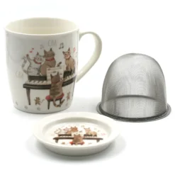 Ce pack contient : un carton d’embalage, une tisanière, son filtre et ainsi qu’un couvercle / sous-tasse. Retrouvez des petits chats pianistes sur la tisanière et aussi sur le couvercle / sous-tasse.