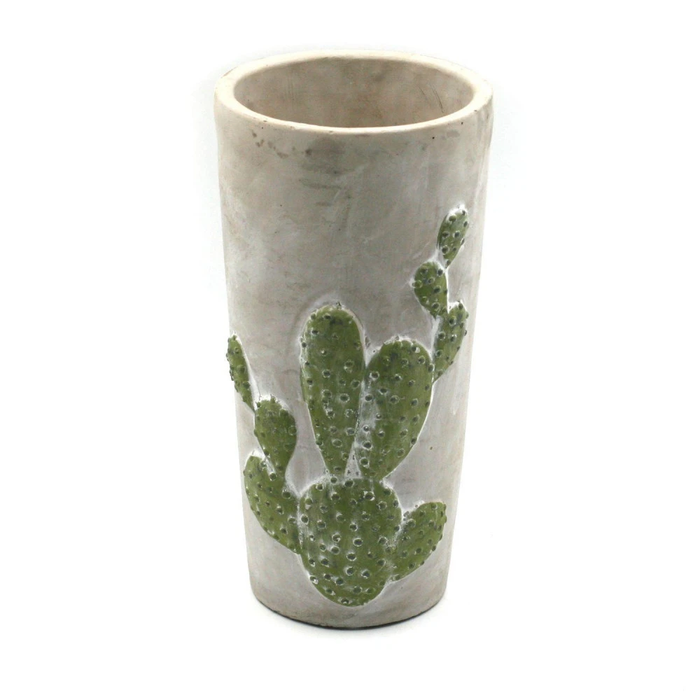 Vase décoratif en pierre reconstituée sur lequel un cactus est représenté